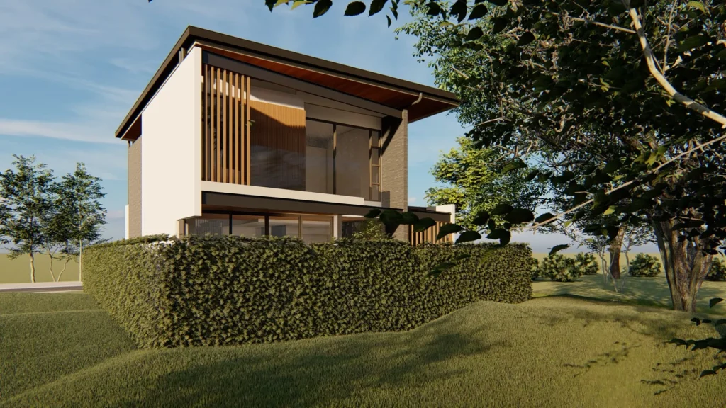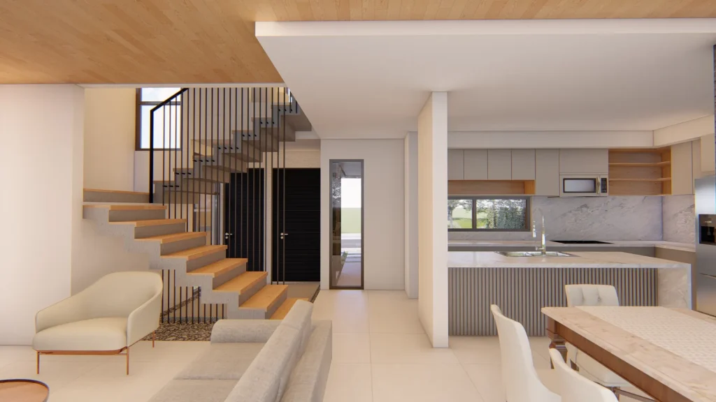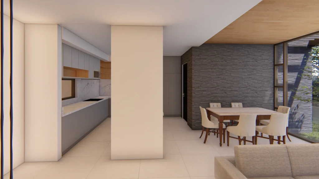 El diseño sigue un concepto moderno con líneas rectas y materiales que transmiten a los propietarios la calidez del hogar deseado. Las vistas existentes se aprovechan mediante una terraza en el primer nivel y balcones en el segundo, mientras que los amplios aleros sirven de aliados adicionales para controlar el clima de la vivienda.