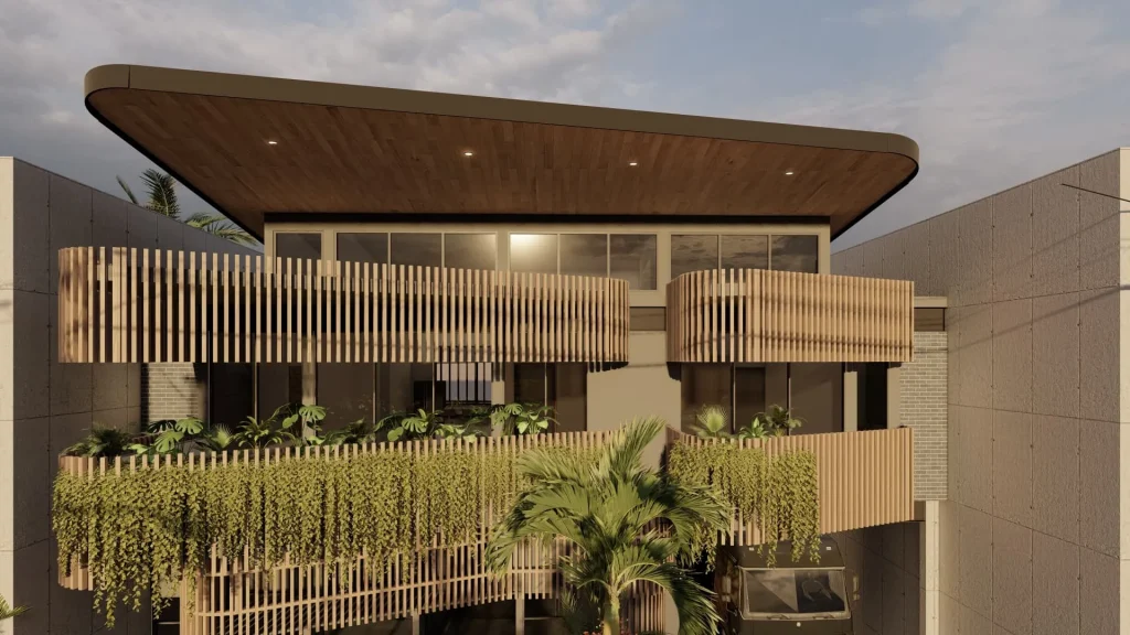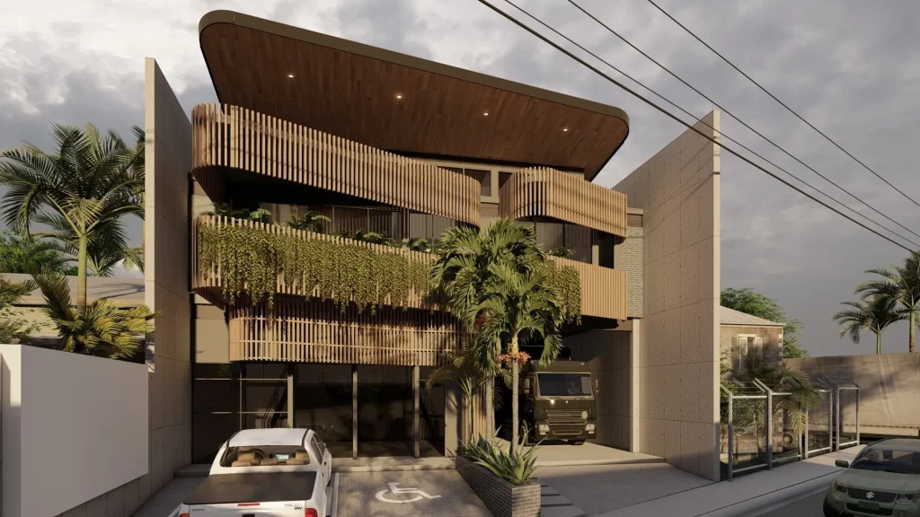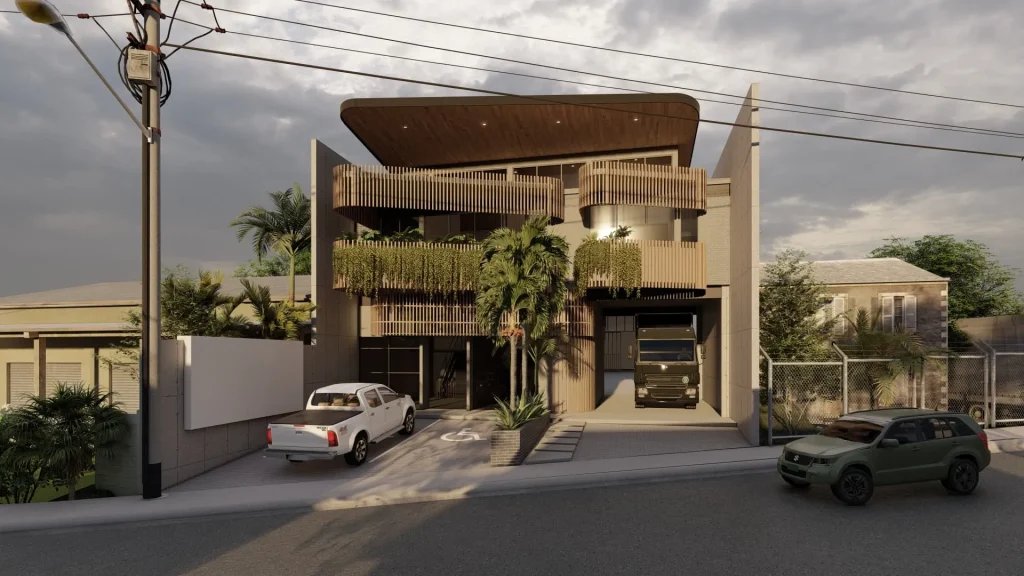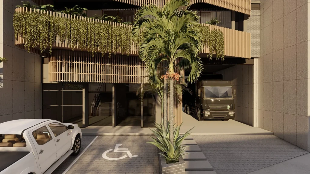 Para lograrlo, se ha considerado una distribución que prioriza el confort y la eficiencia. Los espacios comerciales se sitúan en la planta baja, con un diseño modular y flexible para atender diversas necesidades comerciales. La fachada, además de ser atractiva, está diseñada para captar la atención de los transeúntes y reflejar la identidad de los comercios y protegerla del calor solar directo con un conjunto de lamas verticales y vegetación.