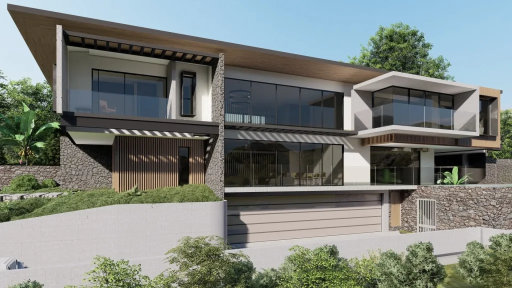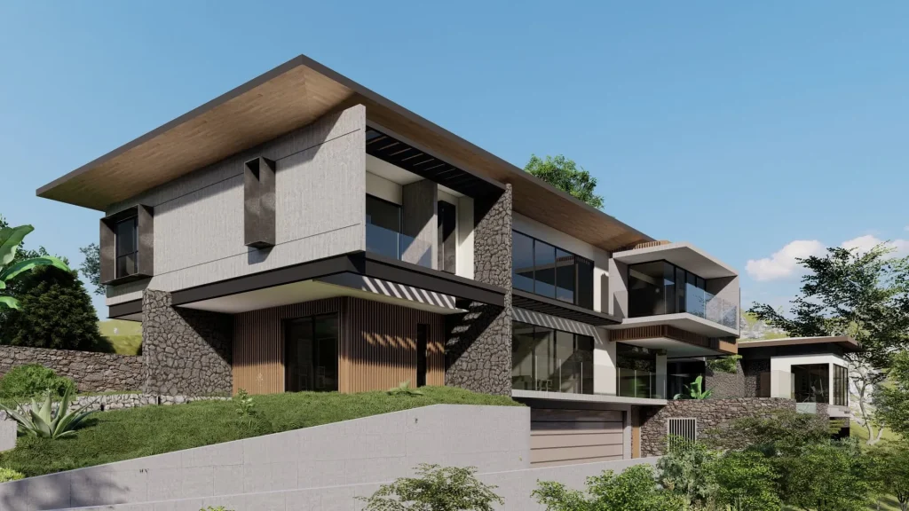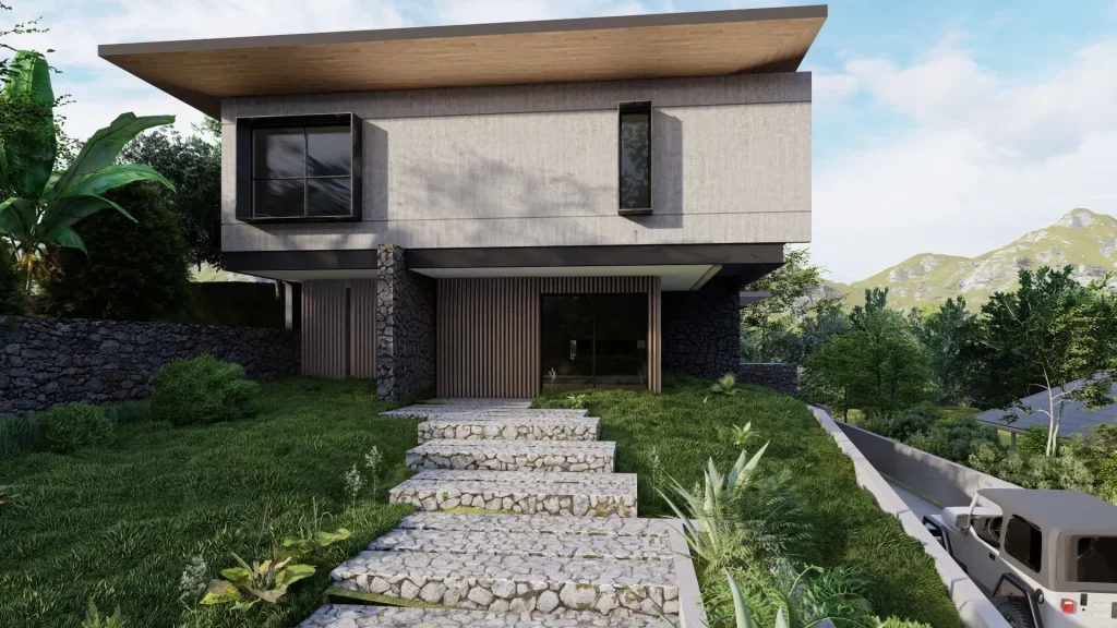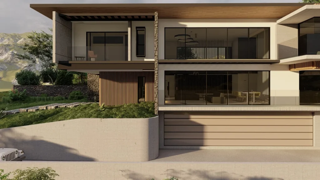 El proyecto consta de 2 niveles y un semisótano, donde se ubican algunos espacios no habitables para reducir la huella en el primer nivel y aprovechar la pendiente del terreno para el acceso al garaje.