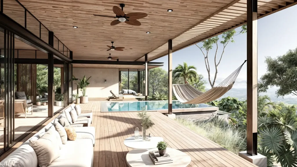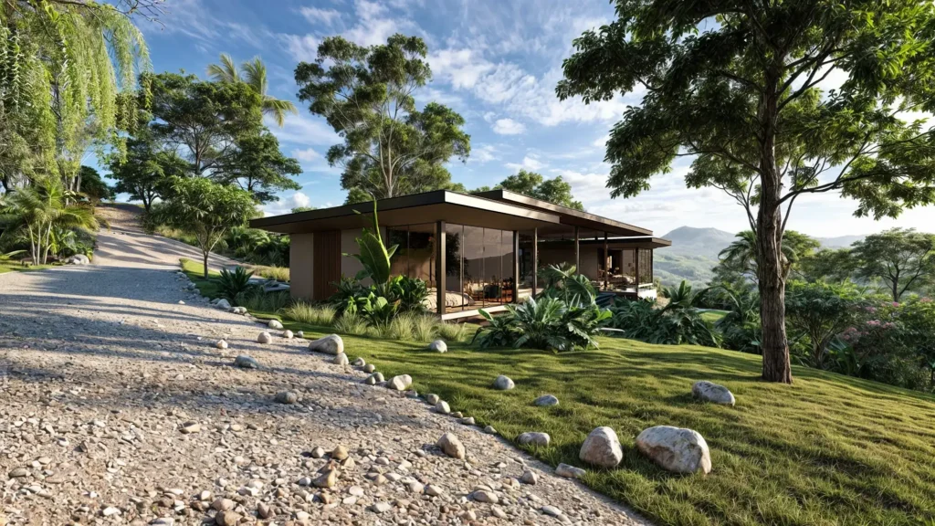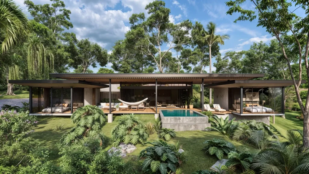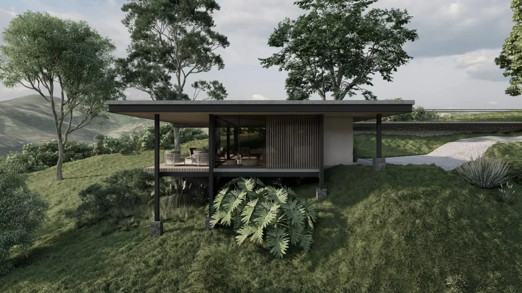 La casa de huéspedes, diseñada con la misma consideración, se ubica más abajo en la pendiente, manteniendo su propia privacidad mientras disfruta de vistas expansivas del océano. Esta estructura está diseñada para complementar la casa principal con elementos de diseño similares, asegurando una estética cohesionada. Ambas casas están conectadas por una serie de caminos exteriores, permitiendo a los residentes e invitados explorar la propiedad mientras disfrutan de la belleza de los alrededores tropicales. El diseño maximiza el potencial del terreno, creando dos espacios de vida distintos pero interconectados que aprovechan la topografía natural y ofrecen vistas incomparables de la costa.