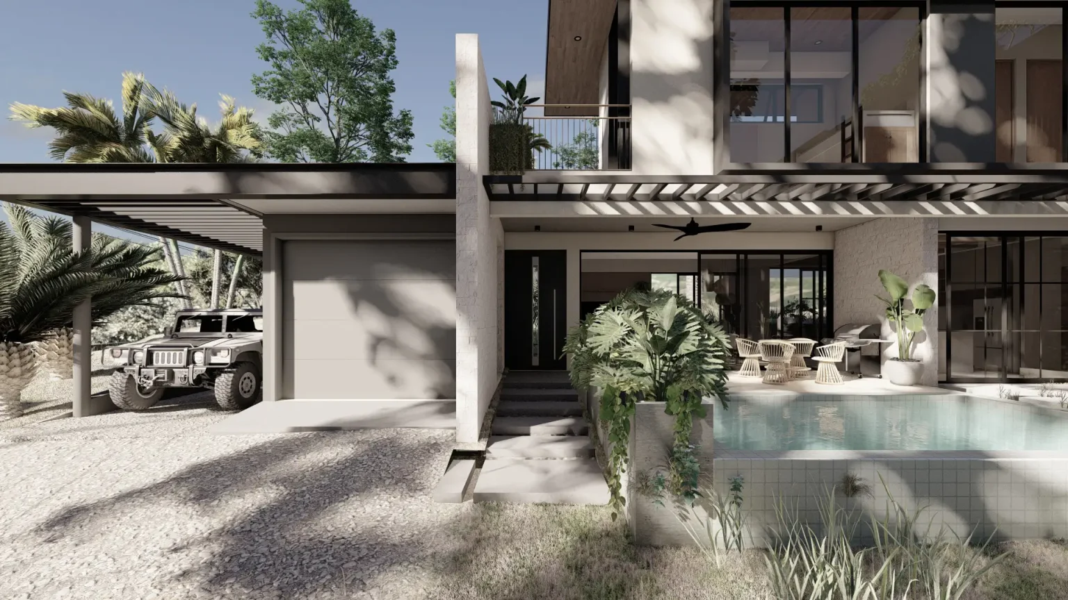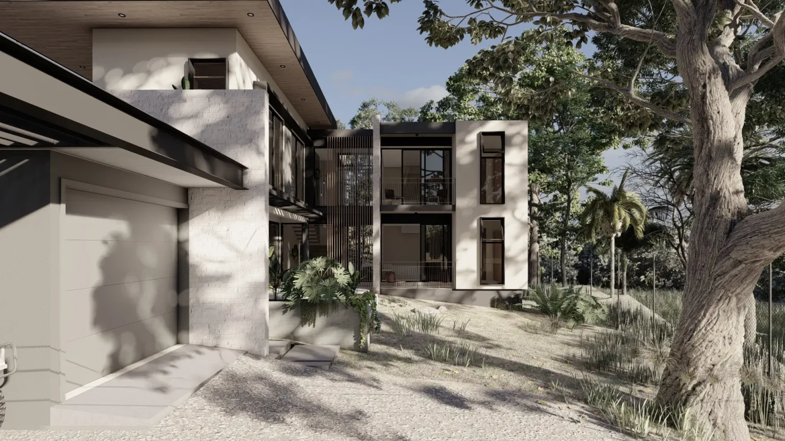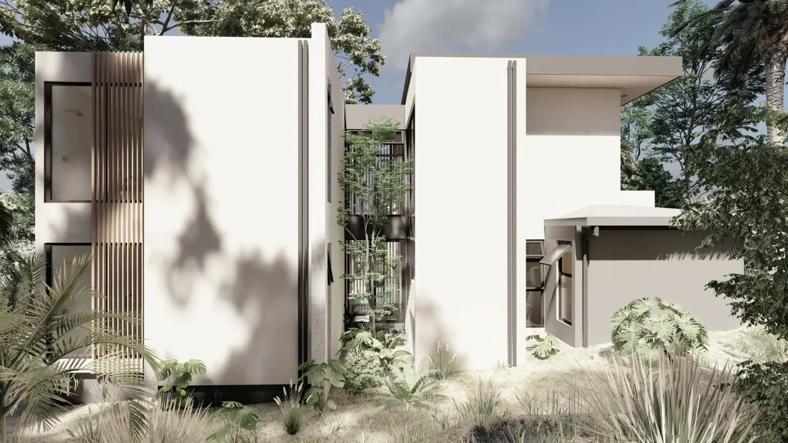 This residential architectural project is designed to provide a modern, functional space that connects seamlessly with nature. The house features a two-story structure, prioritizing natural light and cross ventilation, thanks to an abundance of windows and sliding doors that open directly to the patio, creating a smooth transition between indoor and outdoor spaces. The design aims to maximize space usage by integrating the home with its natural surroundings, offering a sense of openness and brightness in every corner.