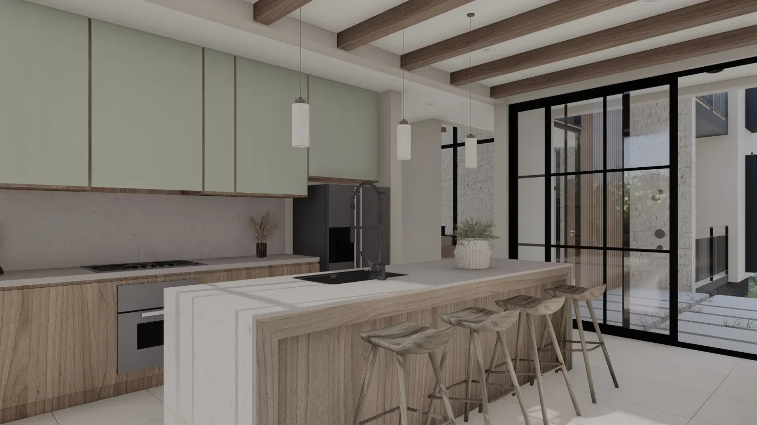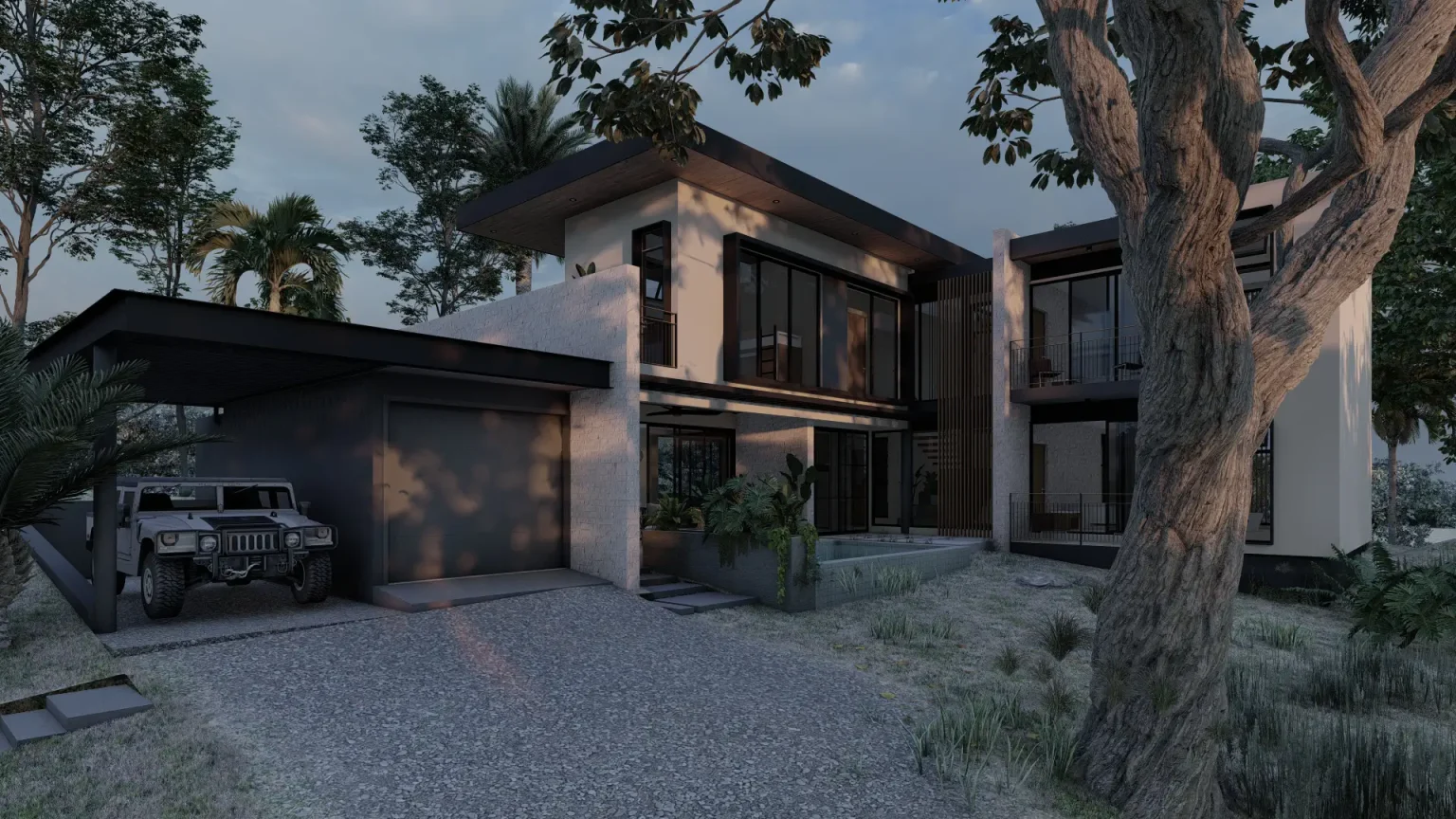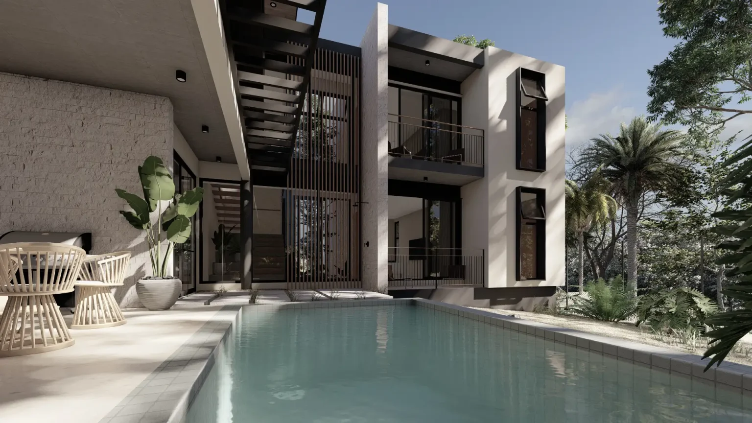 This residential architectural project is designed to provide a modern, functional space that connects seamlessly with nature. The house features a two-story structure, prioritizing natural light and cross ventilation, thanks to an abundance of windows and sliding doors that open directly to the patio, creating a smooth transition between indoor and outdoor spaces. The design aims to maximize space usage by integrating the home with its natural surroundings, offering a sense of openness and brightness in every corner.
