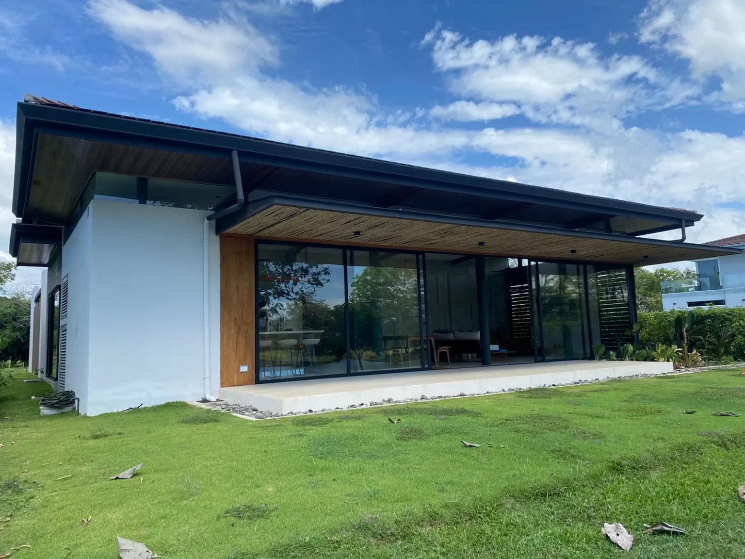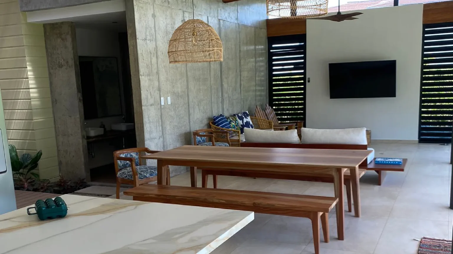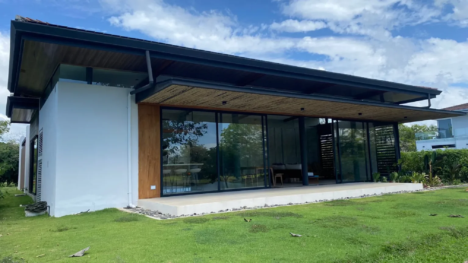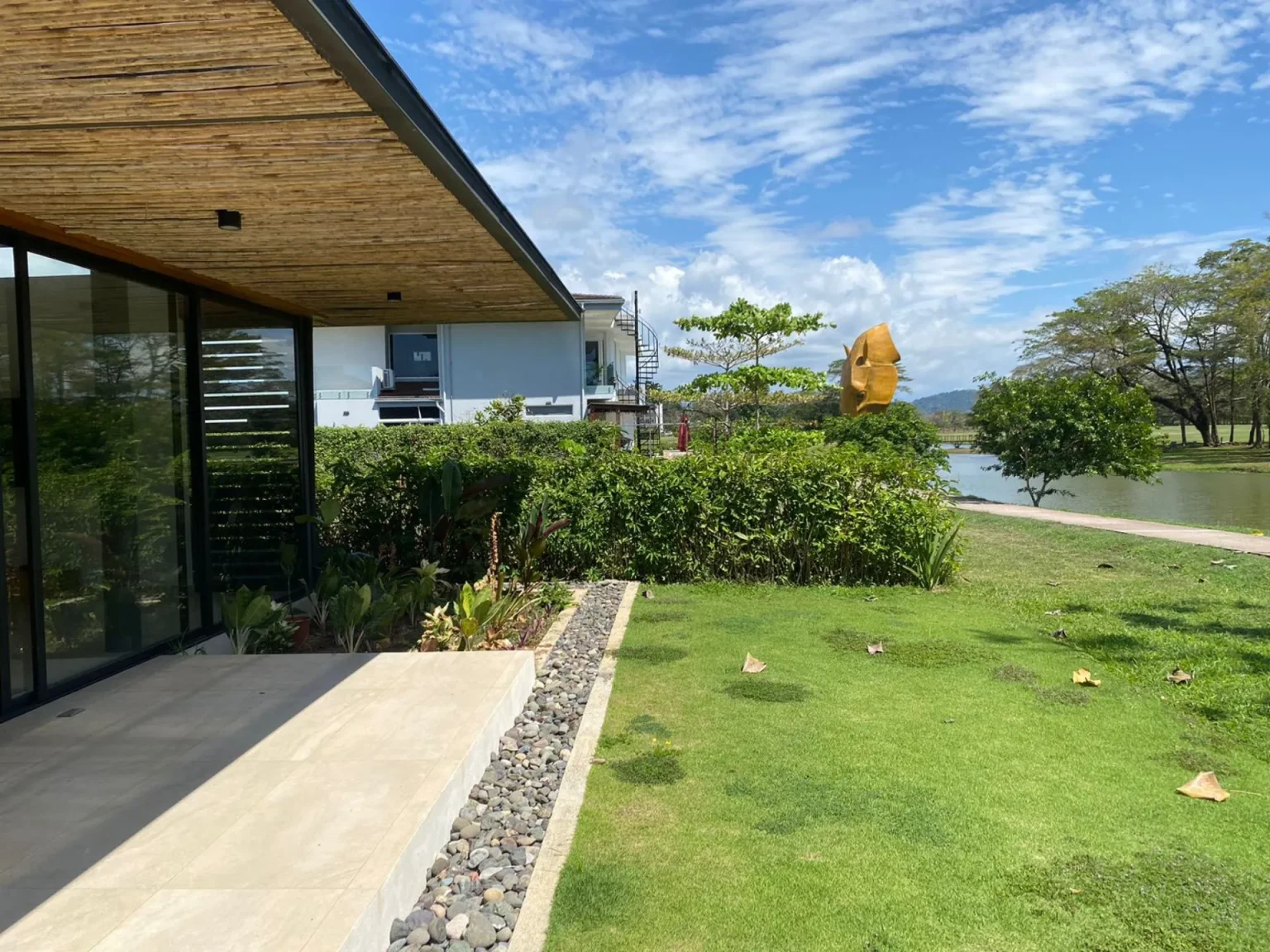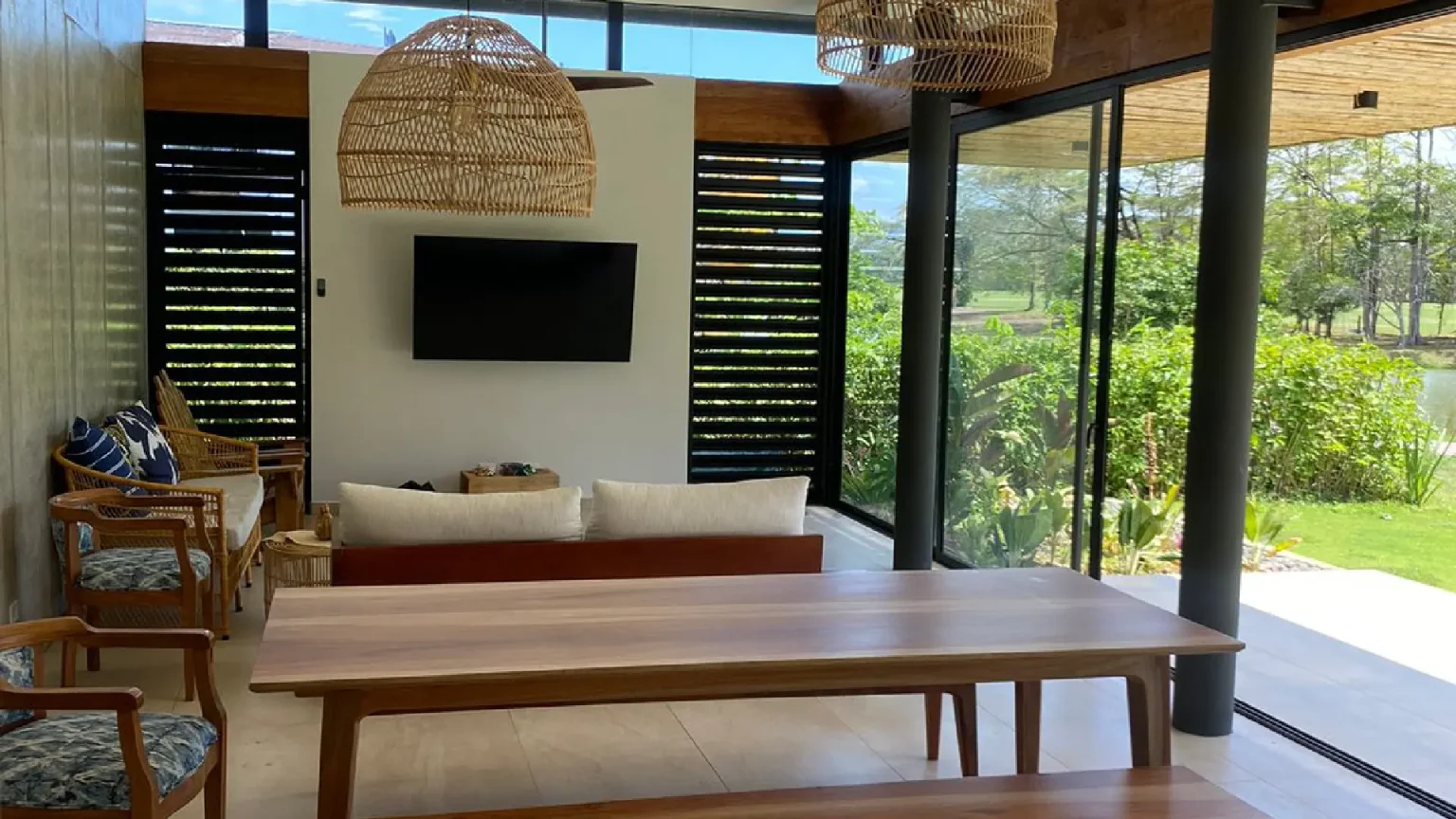 This house is a true tribute to the materiality of the charming residences in the Limonense tropics of our country. With a contemporary interpretation, a unique and captivating space has been created. As you walk through a covered passage surrounded by vegetation, the rooms of this project seamlessly connect, guiding us from the main entrance to the social area. From here, a panoramic view of a serene lake nearby is revealed, providing an idyllic setting to enjoy and relax.