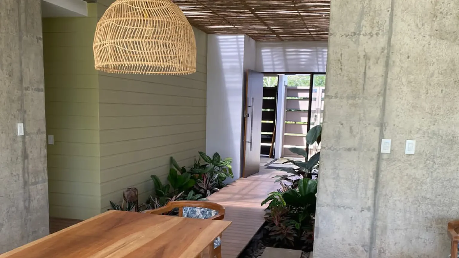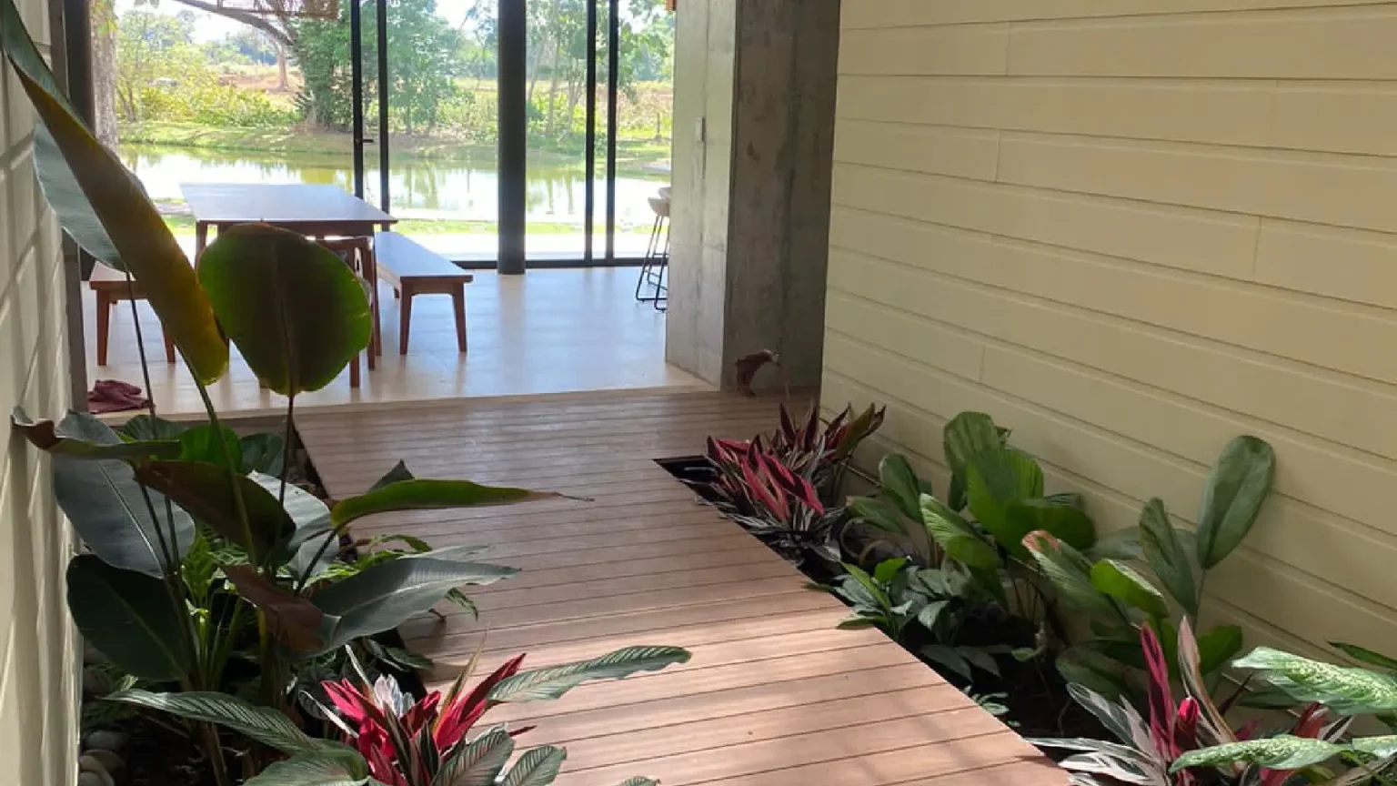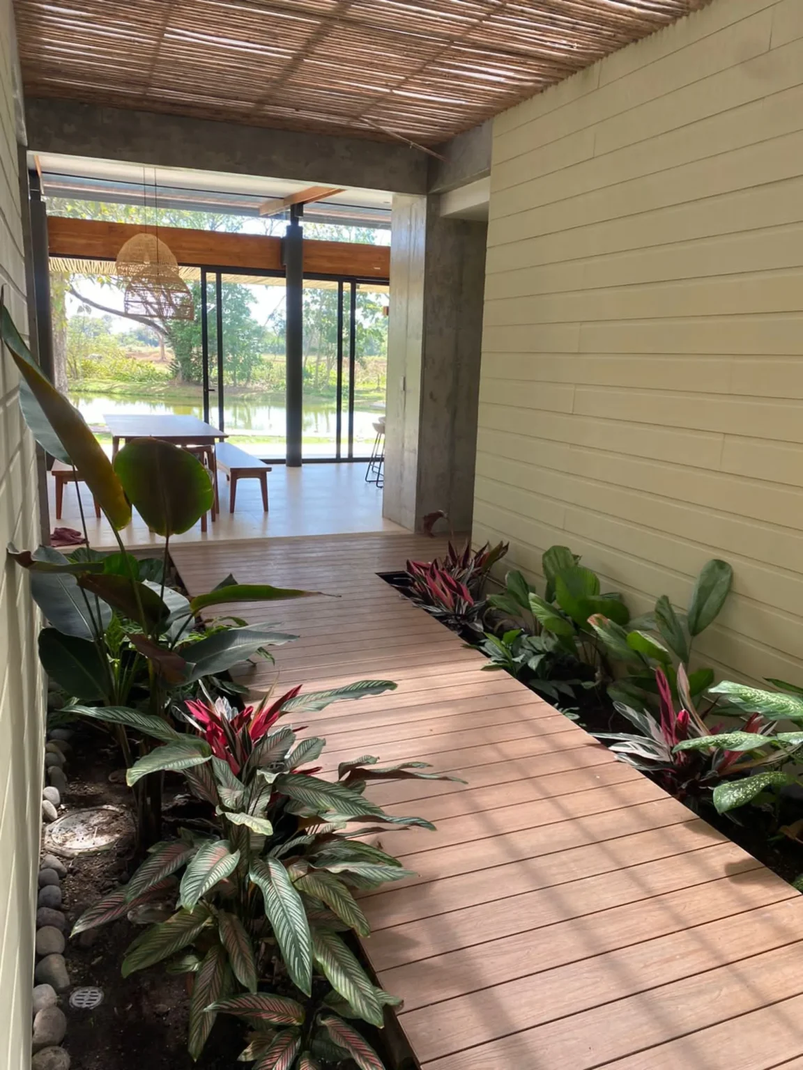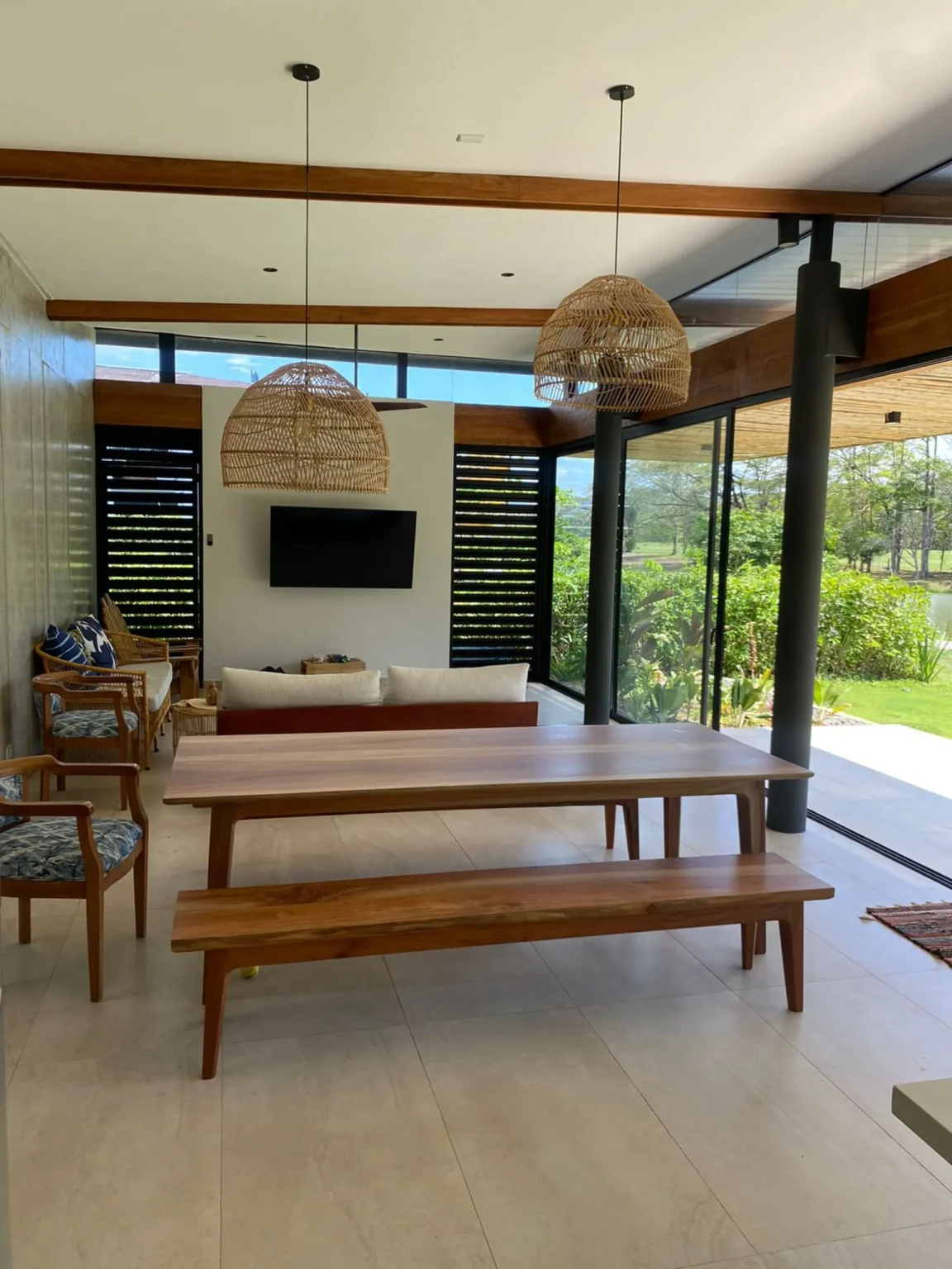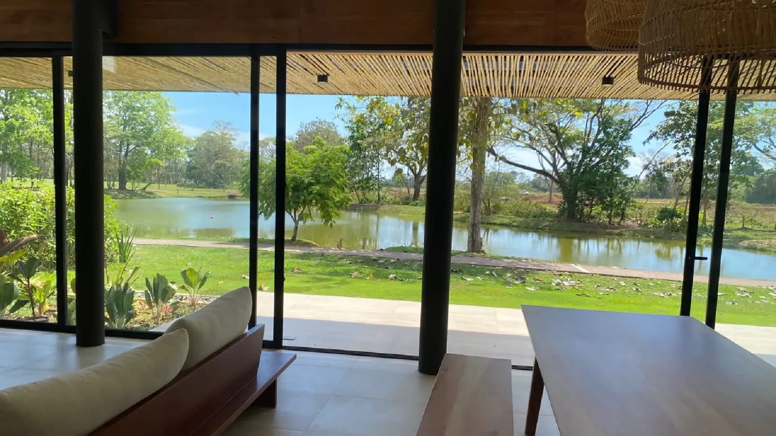 This house is a true tribute to the materiality of the charming residences in the Limonense tropics of our country. With a contemporary interpretation, a unique and captivating space has been created. As you walk through a covered passage surrounded by vegetation, the rooms of this project seamlessly connect, guiding us from the main entrance to the social area. From here, a panoramic view of a serene lake nearby is revealed, providing an idyllic setting to enjoy and relax.